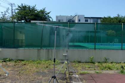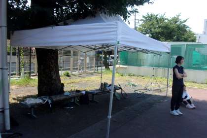 テニスコートにはテントの下で休息をとり水分補給を行っています。ミスシャワーも活用しています。