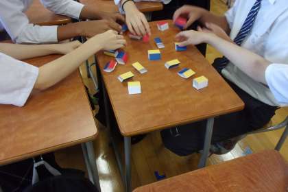 4色に分けられた紙を使ったこのゲームは、班を4グループに分けてそれぞれにミッションが与えられていますが、各グループがミッションを達成にするには必ず対立が生まれてしまいます。さて、ではこの対立を解決するには・・?といったゲームです。