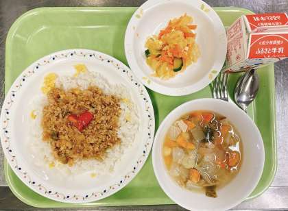今日はタイ料理のガパオライスです。ガパオはバジルという意味で、ひき肉にナンプラーやバジルを入れて炒めた具材をご飯にかけて食べます。給食でもフレッシュバジルを使い、ナンプラーは控えめに加えて仕上げました。