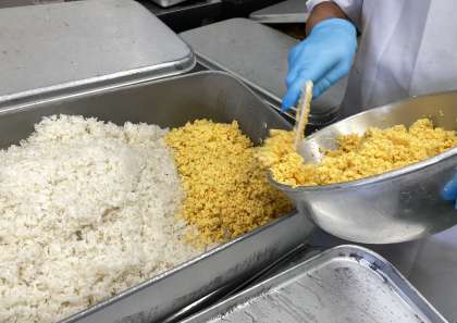 ガパオライスには目玉焼きがのるのですが、大量調理では難しいところ。今回は炒り卵を作り、ご飯の横に配缶しました。