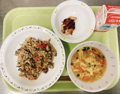 【献立】 ・ひじきご飯 ・鶏みそ焼き ・大根のかきたま汁 ・牛乳