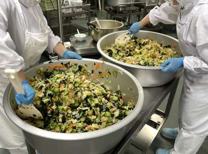 わかめときゅうりの酢の物作成中です。給食では野菜も調味料も一度加熱してから冷やして混ぜています。