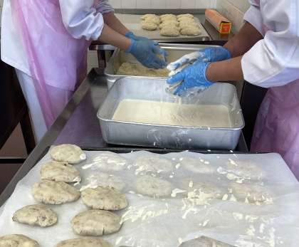 コロッケ作成中。じゃがいもをふかし、炒めたひき肉、玉ねぎと合わせた生地を小判形に成形していきました。
