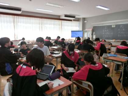 3年生の保健体育の授業です。今日はジグゾー学習で学びを深めていきました。ジグゾー学習法はテーマに沿って、班で役割分担を決め、自分の調べた内容を他の生徒に説明していく方法です。ちなみに今日のテーマは「快適な環境とはどのような環境か」でした。