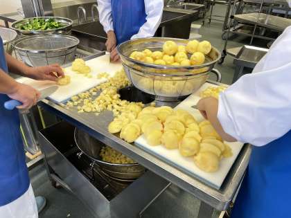 スパニッシュオムレツに入れるじゃがいもを切っています。1cm角に切り、蒸して火を通してから他の具材と炒め合わせています。