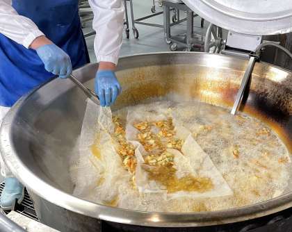 かき揚げは、クッキングシートの上に成形します。シートごと油の中に入れ、少し置いたらシートを引き出して揚げていきます。