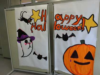 今日はハロウィンのパフォーマンスデーです。こちらは美術室前にある仮装用のフォトスポットです。休み時間に利用できます。