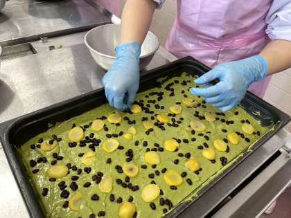 表面にスライスした栗を乗せて、十三夜の月のようにイメージ。全員に栗が行き渡るように丁寧に並べてくれました。