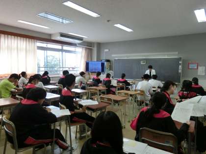 3年生の理科の授業です。今日は先週行われた積み重ね総合テストを返却し解答、解説を行いました。