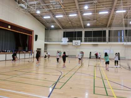 バドミントン部の活動の様子です。多くの部員を抱えるバドミントン部ですが、体育館の半面を効率よく使って練習しています。