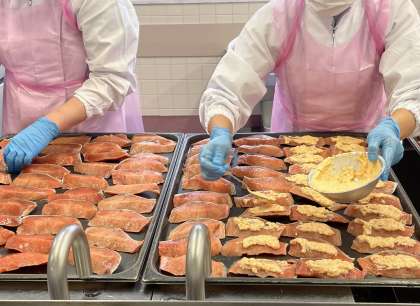 今日は旬の鮭に秋の色づきをイメージしたソースをかけて焼く「鮭の紅葉焼き」です。焼き上がると黄色や赤に色づいた木々のようです。