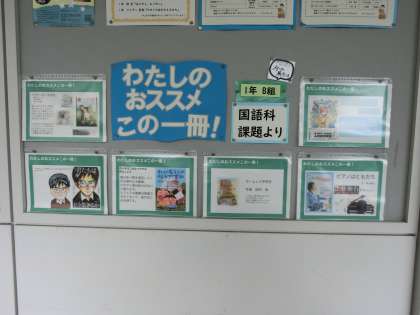 メディアセンター前に「私のおすすめ本」を紹介しています。現在は1年B組の生徒のおすすめ本です。
