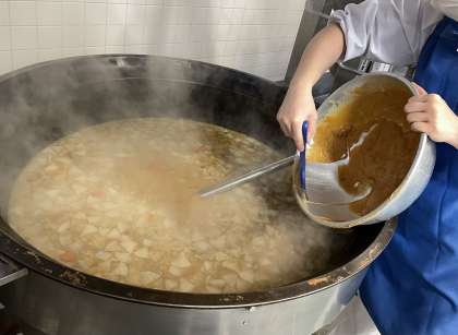 今日のように寒い日は具だくさんな汁物で、体を温めましょう。給食室では、味噌がダマにならないように温めた出汁で溶いてから釜に入れます。生徒たちは寒さのせいか普段より汁物をしっかり食べている様子でした。