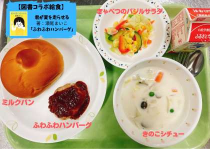 今月の図書コラボ給食は、瀬尾まいこさん著の《君が夏を走らせる》から《ふわふわハンバーグ》を作りました。名前通りふわふわの仕上がり。