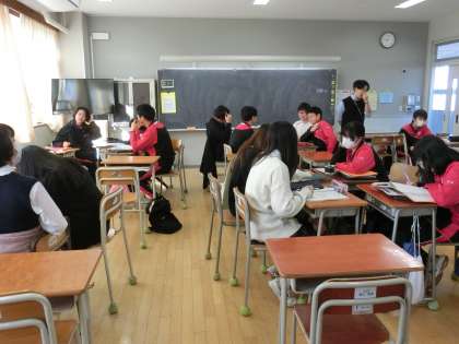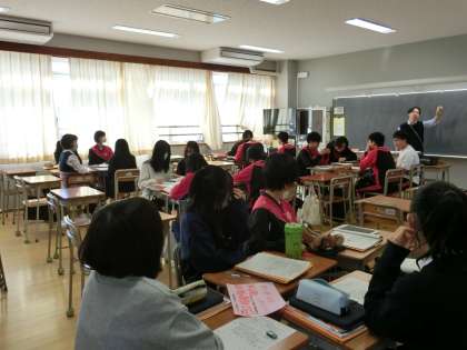 3年生の社会の授業です。今日は国会についての学習で班で検討し法律案を作り、委員会、本会議で審議するという’模擬国会’を行いました。