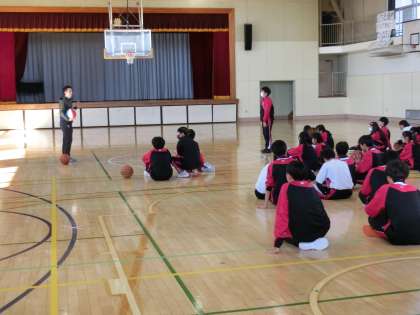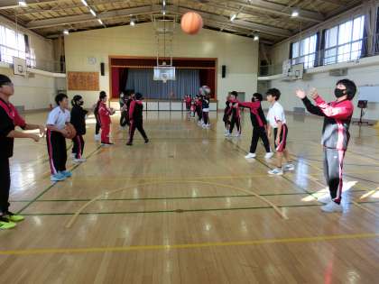 1年の保健体育の授業でバスケットボールが始まりました。きょうはパスの練習です。