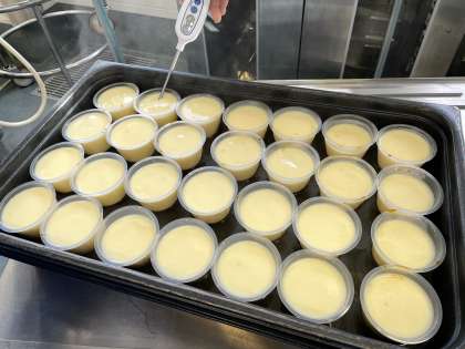プリンが蒸しあがったところです。温度を確認してあら熱をとってから冷やしていきます。