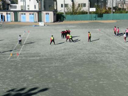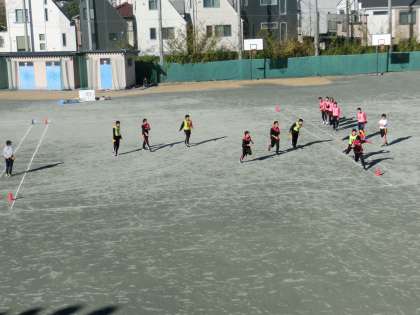3年生の保健体育ではタグラグビーが始まりました。タグラグビーはラグビーを基本としていますが、タックルなどの身体接触を避け、かわりに腰につけたタグを奪うことでタックルの代わりとなるものです。ボールはラグビーボールとほぼ同じものを使用します。