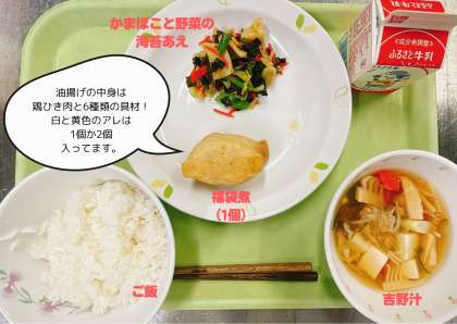 福袋煮は、いなり寿司のような仕上がりです。油揚げの中にひき肉と6種類の具材を入れて煮つけています。味がしっかり染みておいしくできあがりました。