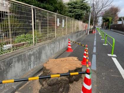 本校の東側の歩道に街路樹として植えられていた桜の木が伐採されました。かなりの老木で倒木の恐れがあるとのことでした。やむを得ないですが少し寂しい気もしますね。