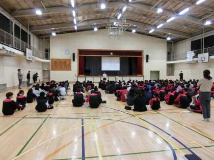 2年生の学年集会です。学年委員長より学年全外の今学期の反省について発表した後。先生方より生活面と学習面についてお話をいたしました。