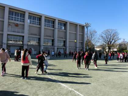1年生の学年レクの様子です。前半はドッジボールを行いました。青空の下に歓声が響きました。