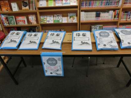 メディアセンター内に図書委員会主催の「図書福袋」を用意いたしました。福袋は「映画が好きな人」「スポーツな好きな人」などのジャンルに分かれており、一つの福袋に3冊入っています。中には「本が嫌いな人向け」という福袋もありました。是非利用してください。なお、福袋はなくなり次第終了となります。