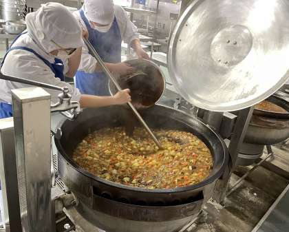カレーの味の決め手となる手作りルーを入れていく様子です。かき混ぜの手を止めないように2人体制で入れていきます。