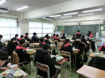 本日より3学区委の給食がスタートしました。こちらは1年生の様子です。今日はチキンカレー。何人もの生徒がおかわりをしていました。