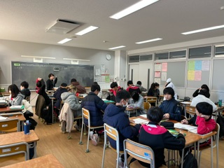 2年生の社会では、関東地方の工業と農業について班で考えをまとめ、黒板に書いてクラス全体で共有しました。