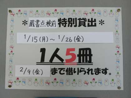 1月29日(月)より2月2日(金)までの期間で蔵書点検を行います。そのためこの期間はメディアセンターを閉館いたしますのでご了承ください。また、それに伴いまして26日までの期間で一人につき5冊まで貸し出しをいたします。返却期限は2月9日までです。是非利用してください。
