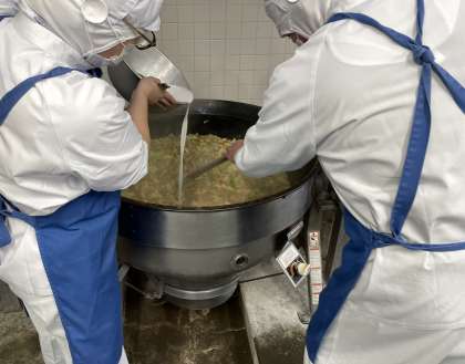 あんかけ焼きそばには、野菜たっぷりのあんを作ります。片栗粉でトロミをつけますが、ダマにならないように2人体制です。濃度の様子もみながら加えます。