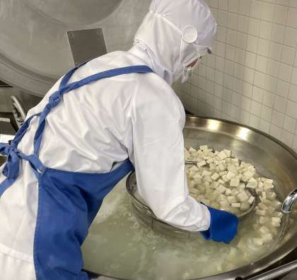 豆腐を事前に加熱する事で、煮崩れを防止し味もなじみやすくなります。給食は使う豆腐の量が多いので大切なポイントです。