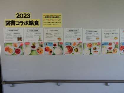 メディアセンター前の廊下に今年度の図書コラボ給食のメニューを展示しました。今月は28日に冬森灯著「うしろむき夕食店」に出てくる料理です。楽しみにしましょう。