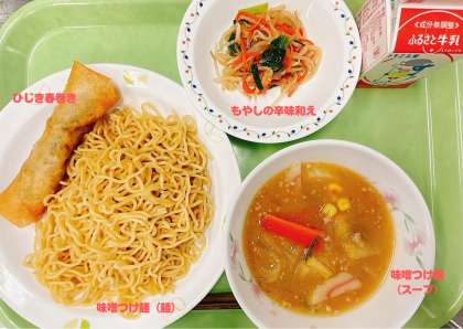 【献立】 ・味噌つけ麺 ・ひじき春巻き ・もやしの辛味和え ・牛乳