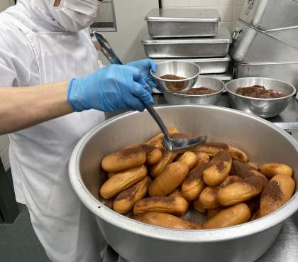 1クラス分ずつ揚げたパンに、砂糖とココアと塩を混ぜた粉をかけていきます。この後しっかり絡めて食缶に入れます。