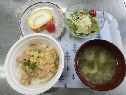 今日のメニューは親子丼。味噌汁とサラダ、それにデザートが付いています。大好評でした。