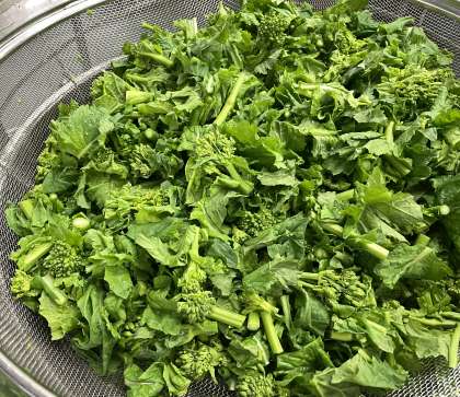 春の食材『菜の花』をおひたしに使いました。茹でる前の菜の花、青々としていておいしそうです。