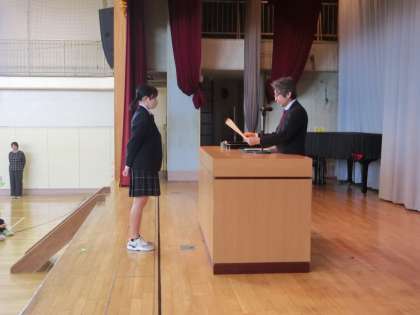 世田谷区の生徒表彰です。全日本通信陸上で見事3位に入賞した3年生の女子生徒が世田谷区から表彰を受けました。