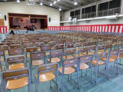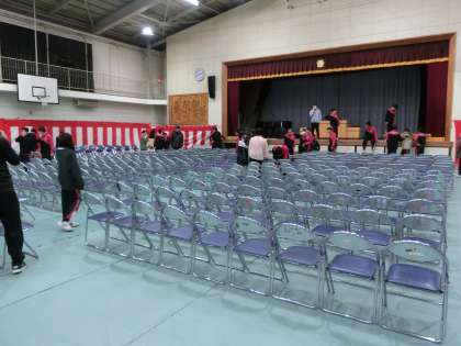 椅子、紅白幕、国旗、区旗、校旗、マイク、演台、式次第と出来上がっていきました。