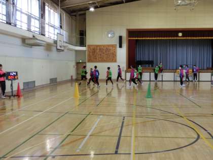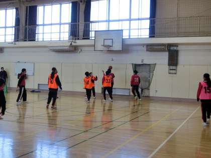 1年生の学年レクです。前半は希望する種目に分かれて行いました。こちらはバスケットボールの様子です。