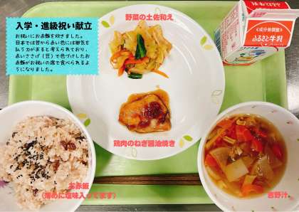 今日から令和6年度の給食が始まりました。初日は入学と進級を祝ってお赤飯の献立です。