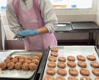つくねを1つ1つ作っています。レンズ豆、たまねぎ、にんじん、しょうがなどを入れて食感も楽しめるつくねです。