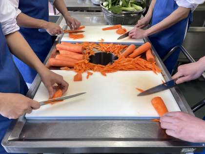 あんかけ焼きそばにはタケノコ、にんじん、玉ねぎ、キャベツなどたくさんの野菜を使っています。今日のにんじんはひし形になる「中華短冊」にしています。