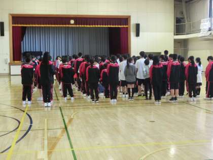 1年生は5時間目に学年集会を行いました。こちらは集合・整列体形の説明を受けている様子です。