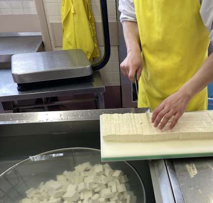 麻婆豆腐の豆腐を切っています。切った豆腐は流水にさらして保管、釜で水から下茹でして麻婆の具材と合わせていきます。
