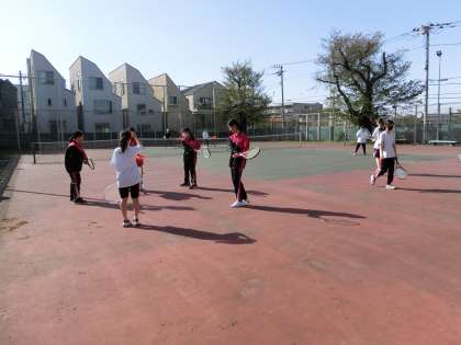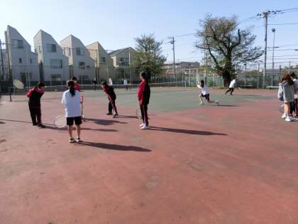 女子のテニス部の活動の様子です。上級生が新入生に球出しをしてスイングの指導を行いました。