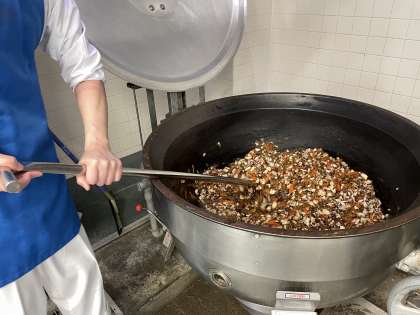 たこめしの具材を使っている様子です。たこは、硬くならないように最後の方で炒め合わせています。