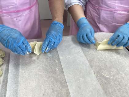 ツナとポテトのパリっと揚げは、具材を餃子の皮に包んで揚げています。包む時に皮を立てながら四角に包みました。揚げ油に入れると皮が立ってくれてパリっと揚がりました。