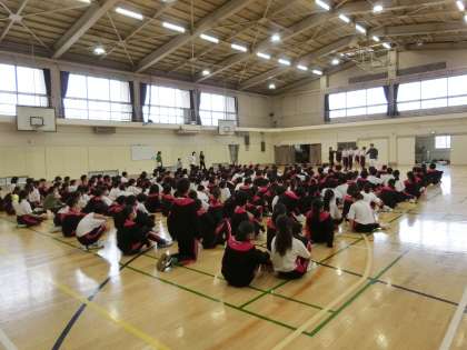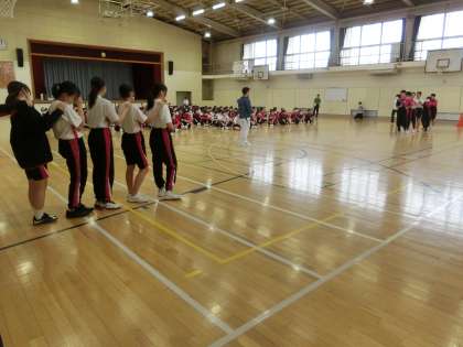 2年生の学年練習の様子です。雨天のため体育館で行いました。学年種目のむかでリレーの説明です。
